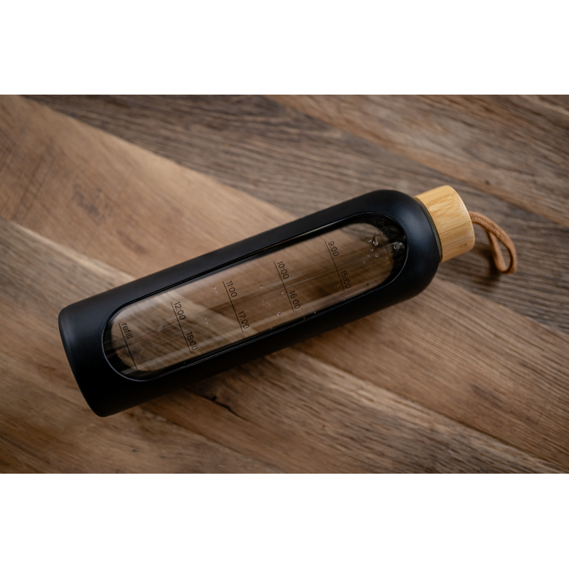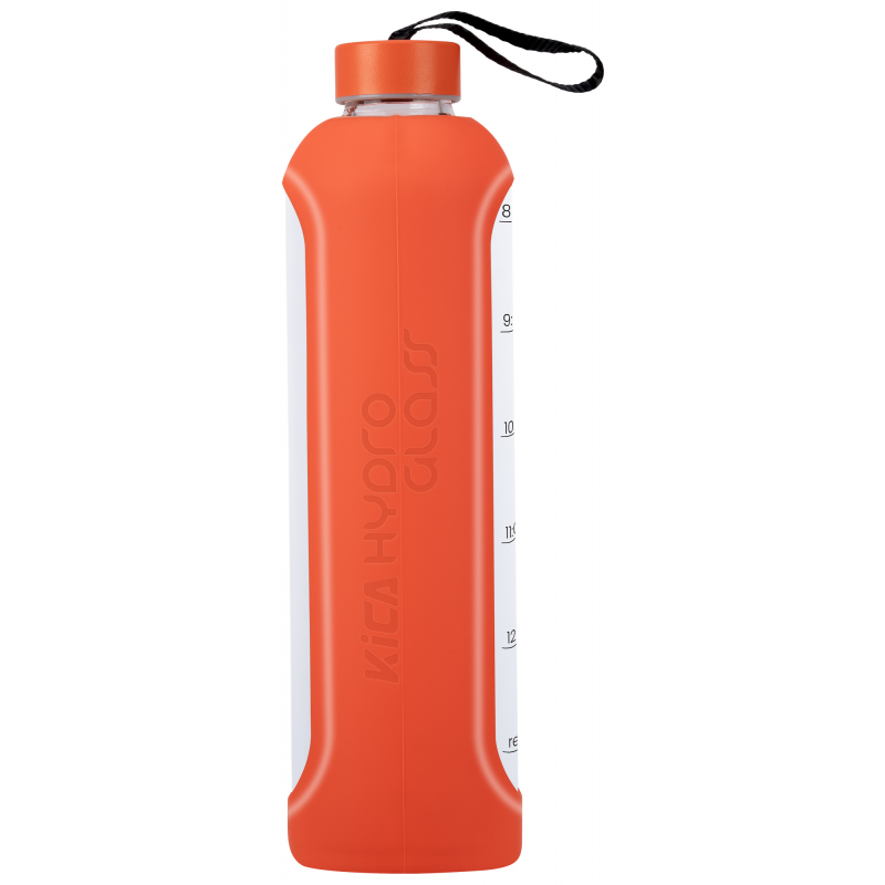 KiCA Hydro Glass to wszechstronna butelka wielokrotnego użytku o pojemności 1 litra. Wykonano ją ze szkła, które nie wpływa na smak napojów i jest bezpieczne dla Twojego zdrowia. Silikonowa osłona chroni przed uszkodzeniami i gwarantuje pewny chwyt. Elegancki korek ze stali nierdzewnej zapewnia dobrą szczelność. Zintegrowany sznurek ułatwia przenoszenie. Specjalna podziałka z godzinami pomaga kontrolować nawodnienie w ciągu dnia, a linia „refill” przypomina o konieczności ponownego napełnienia butelki. Dostępna w siedmiu stylowych kolorach: czarnym, różowym, zielonym, fioletowym, szarym, oliwkowym i pomarańczowym. Idealna do pracy, na trening, spacer czy długą podróż.